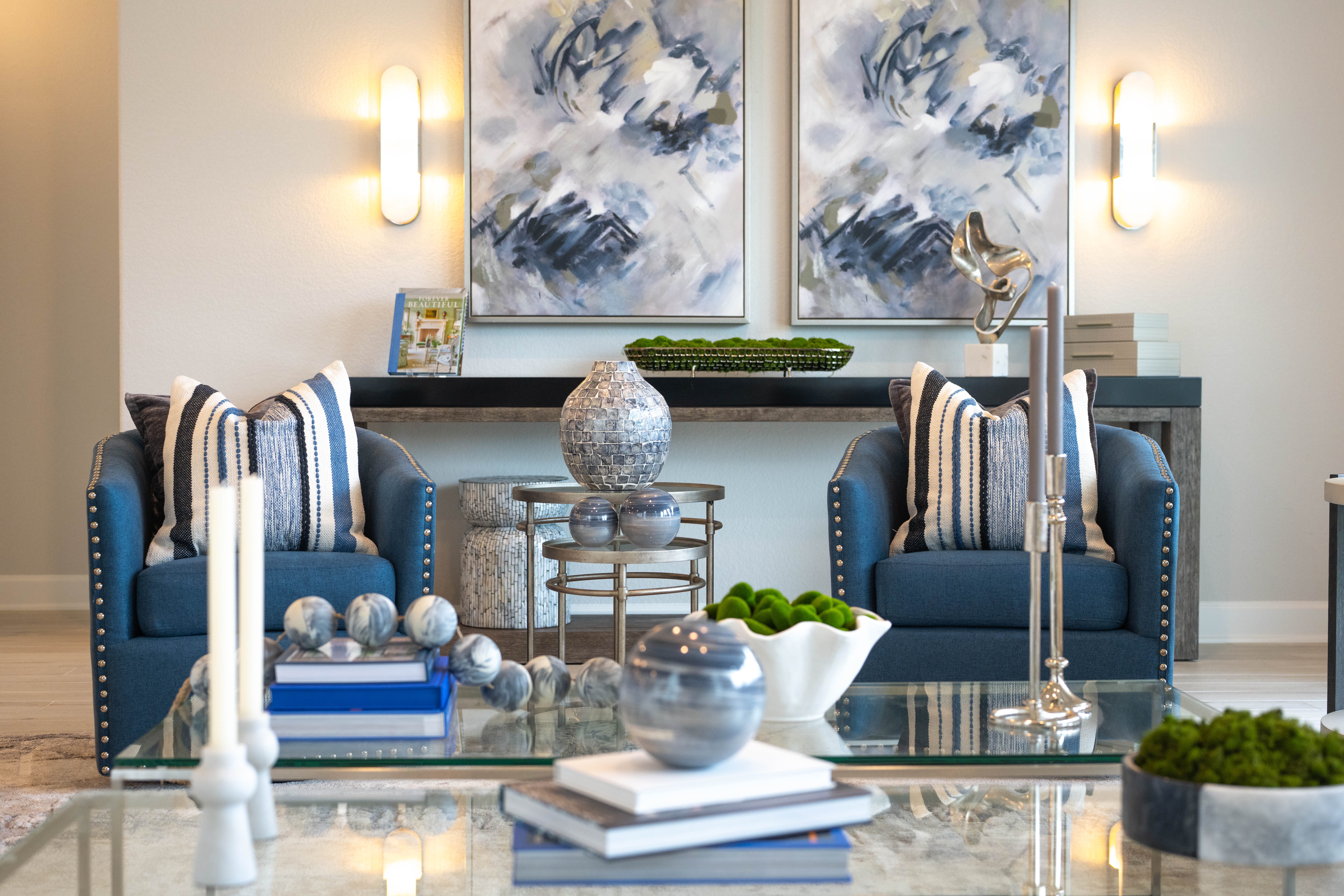 Comfort and flow were central to this design. The room features dual facing sofas, creating a natural symmetry that encourages conversation and togetherness. Two deep blue armchairs anchor the focal point, drawing the eye toward the fireplace wall and art arrangement. This setup allows for generous seating without sacrificing open space — ideal for entertaining extended family during holidays and special occasions.